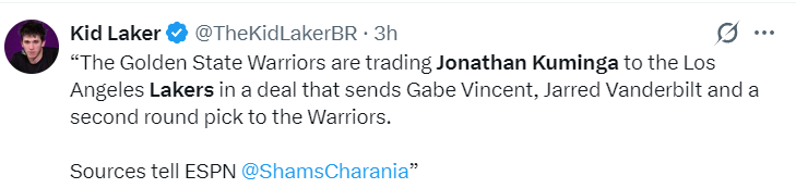 根据Shams在播客节目中的说法,湖人队愿意打包文森特、范德比尔特、1个未来次轮签去换库明加。(文森特是到期合同,范德比尔特还剩两年合同)